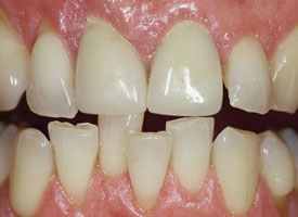 Durch abstehende Kronenränder und durch fehlerhaft verarbeitetes Metall unter der Keramik wurde eine starke Allergie ausgelöst. Diese zeigt sich durch starke Rötung und Schwellung des Zahnfleischs an den Kronenrändern.